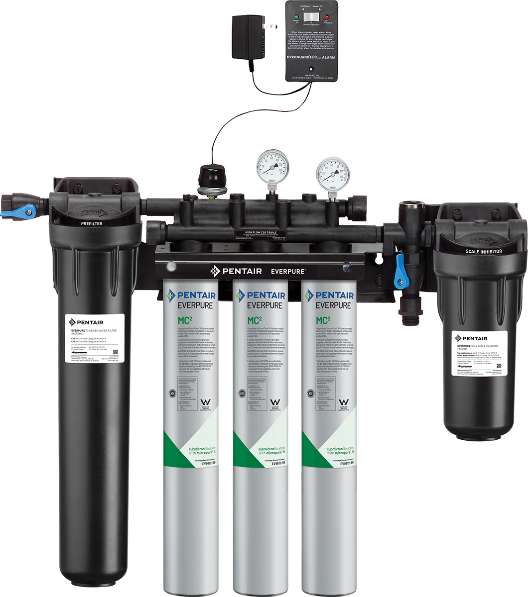 Deliver consistent quality water for fountains, ice machines, coffee and tea brewer applications using the Pentair Everpure High Flow CSR MC2 systems. These systems offer exclusive prefiltration media to reduce chloramines and chlorine taste & odors while effectively filtering particulates down to 0.2 microns. These features minimize scale buildup, help extend the life of your equipment and deliver great-tasting beverages and premium ice.