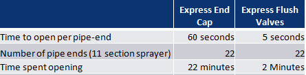 The Hypro Express Flush Valve takes 5 seconds to flush compared to more than one minute to flush others, saving valuable time between loads. An easier and better flushing helps to reduce yield loss from unwanted chemicals in the system. Faster flushing means less time spent in the field not spraying. By eliminating flushing time, operators can be more efficient and optimize spray timing for better yields.