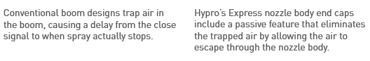 By aspirating the trapped air inside the spray boom, the Express End cap allows for much as much as an 85% reduction in nozzle shut-off time. This reduction in shut-off time saves you money by reducing chemical waste.